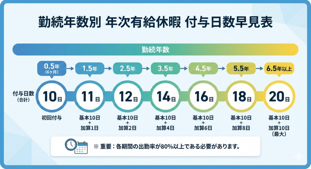 労働基準法では、有給の取得日数について以下の図のように規定されています(労働基準法39条)。