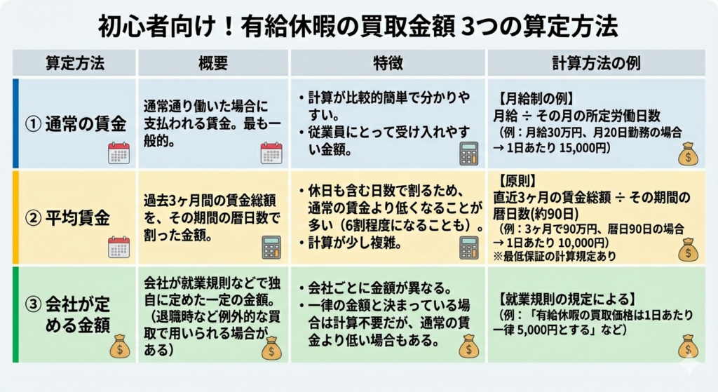 有給買取の単価に法的な定めはありませんが、一般的には以下のいずれの方法によって計算されます。